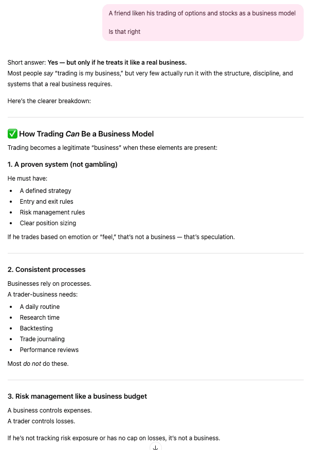 Wassup folks. Feel like writing tonight before sleeping... So here's one for you in case you miss my writing 😂 2 days back, I invited a couple of good friends over to my place for ice cream. If you don't know, there's this very popular ice cream account on ig called @onebyoneicecream Very popular ice cream. It has a 2 year wait list, and his ice cream sells out in seconds. I managed to get his FFF (fastest fingers first) which he posts once a day. Ordered 3 tubs of ice cream which cost $128 lol. You can see the 3 tubs here: This email is not about ice cream though. So there's this ongoing debate with my friends about employee VS entrepreneurship. I used to envy employees a lot, especially the well paid ones in tech/banking... But these days my views has changed. Whatever it is - each has its own challenges. You gotta choose your hard. So over ice cream with my friends... We somehow had a heated debate about business models. This guy is a very highly paid employee. He also trades stocks and options on the side. And he makes good money from his investments. Which is good. But the issue I have is - he classifies that as a business model. Took me a while to debate with him on that... Why? Because my own definition of a business is you have create and sell a product or service to customers. But trading?? How is that a business? I asked him: Who's your customer? What's your product? I was pretty hostile (and I can, cos he's a good friend lol) The thing is, because I started my business from scratch... I have the utmost respect for anyone who also start something from scratch. That's also a reason why I respect hawkers a lot... Because they work damn hard, and they literally start from scratch. So to call his trading a business model, it didn't sit right with me. But after that night, I had a discussion with ChatGPT. Technically, trading stocks and options IS a type of business, if you run it like a business. Meaning you have clear systems in place. Let me show you what ChatGPT says: So yea, I guess it is a business model. Another friend was quick to answer my question. The "product" is the stock itself. The "customer" would be the stock market (where there are willing buyers) So technically, his trading is a business model. I have to admit, it is a good business model. If I can put it very simply - you use money to make more money without having to start something up. Furthermore, my friend added... From a financial standpoint, he prefers this business model because in the long term, he stands a higher chance of winning. He's right. Another mutual friend questioned me. Since I agree it's good - why not go into this "business model"? My answer to him was immediate: It doesn't benefit anyone. You see... Trading in the stock market is zero sum game. If you win, someone loses. How does that add any value to anyone? Which really put things into perspective on why I feel so passionate working with my clients. Because through my work... Through my "business model" I can positively benefit people. When I see them hit their record high revenue... When I see them expand to a bigger location... When they tell me "I can finally breathe better". It has so much impact and meaning. So why do I not choose the "better" business model? Simply because I wanna impact and help more people. I wanna add value to humans and not just play a zero sum game. I wanna play a win-win game. Clients invest in my expertise and skills, and through that, their business grows even more. And it's something I'm gonna keep doing for a long time... 2 days back, a client sent me a voice message to thank me after she converted a lead. She too, felt very heartened that she can spread her mission (she runs a phonics school) through ads. So yes... While we debated about business models. At the end of the day, there is no right or wrong as long, as it's what you truly want to do. Okie, time to sleep. Goodnight 😴